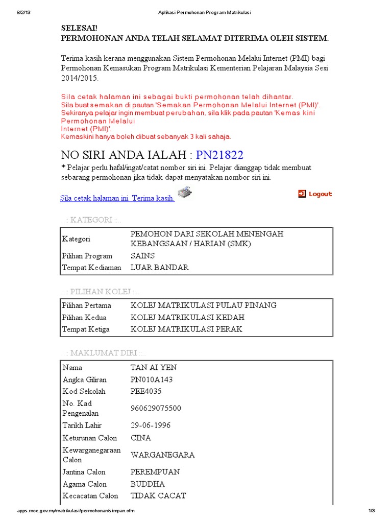 Blog Unit Bimbingan Kaunseling Smk Sungai Kob Aplikasi Kemaskini Permohonan Program Matrikulasi Kpm 2013