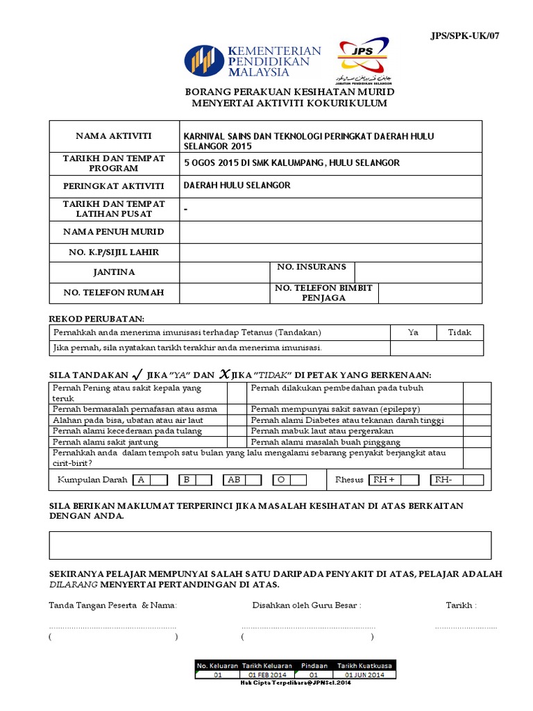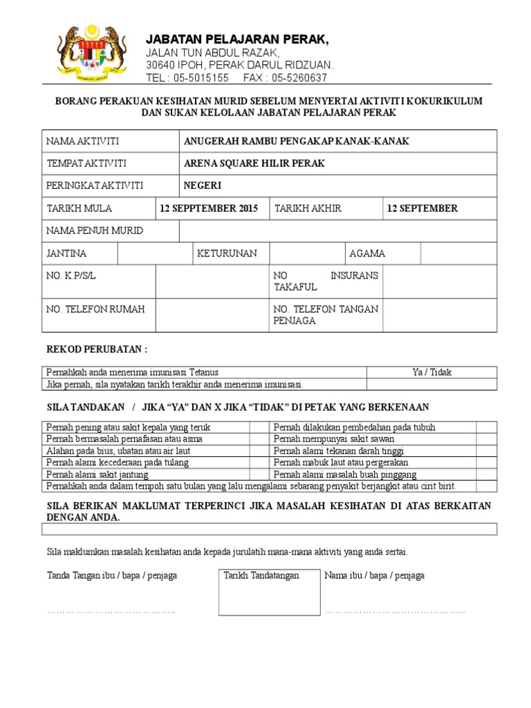 Surat Akuan Kebenaran Ibu Bapa Penjaga Lampiran 2 Borang Perakuan Kesihatan Murid Sebelum Menyertai Aktiviti Kokurikulum Luar Nama Aktiviti Tempat Aktiviti Peringkat Aktiviti Tarikh Mula