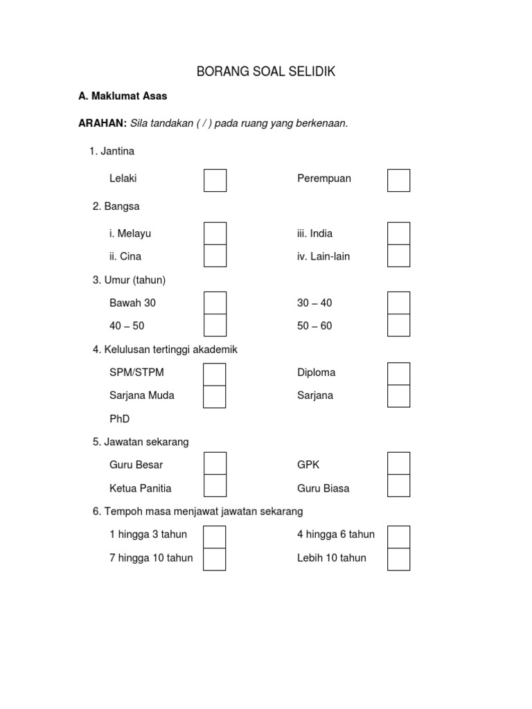 Borang Soal Selidik Borang Soal Selidik Proses Pengorganisasian Dan Gaya Kepimpinan 1 Jantina 2 Taraf Pendidikan Sekolah Rendah Sekolah Menengah Course Hero