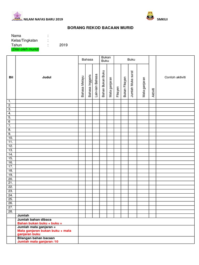 Pusat Sumber Sekolah Borang Rekod Bacaan Murid Sekolah Rendah