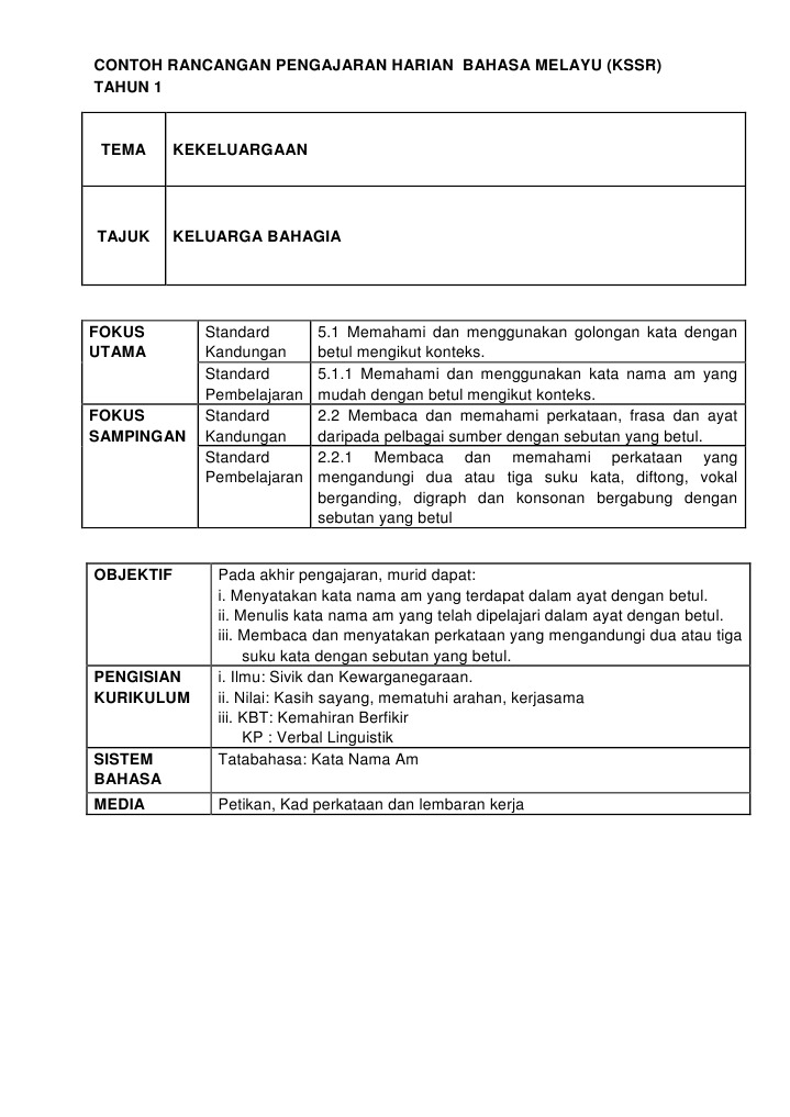 Contoh Rancangan Pengajaran Harian Bahasa Melayu Kssr T1