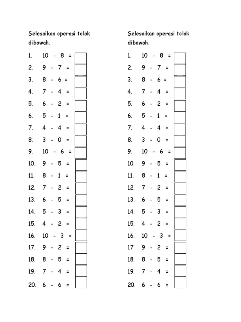 Latihan Matematik Operasi Tolak Untuk Kanak Kanak Kitpramenulis