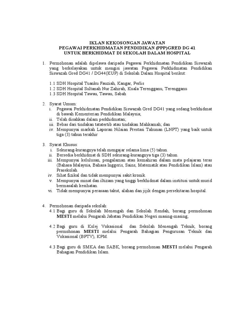 Kekosongan Jawatan Pegawai Perkhidmatan Pendidikan Siswazah Gred Dg41 Dg44 Kup Di Sekolah Dalam Hospital Pendidikanmalaysia Com