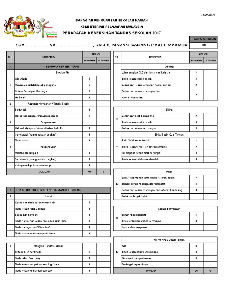 Penarafan Kebersihan Tandas Sekolah Pdf