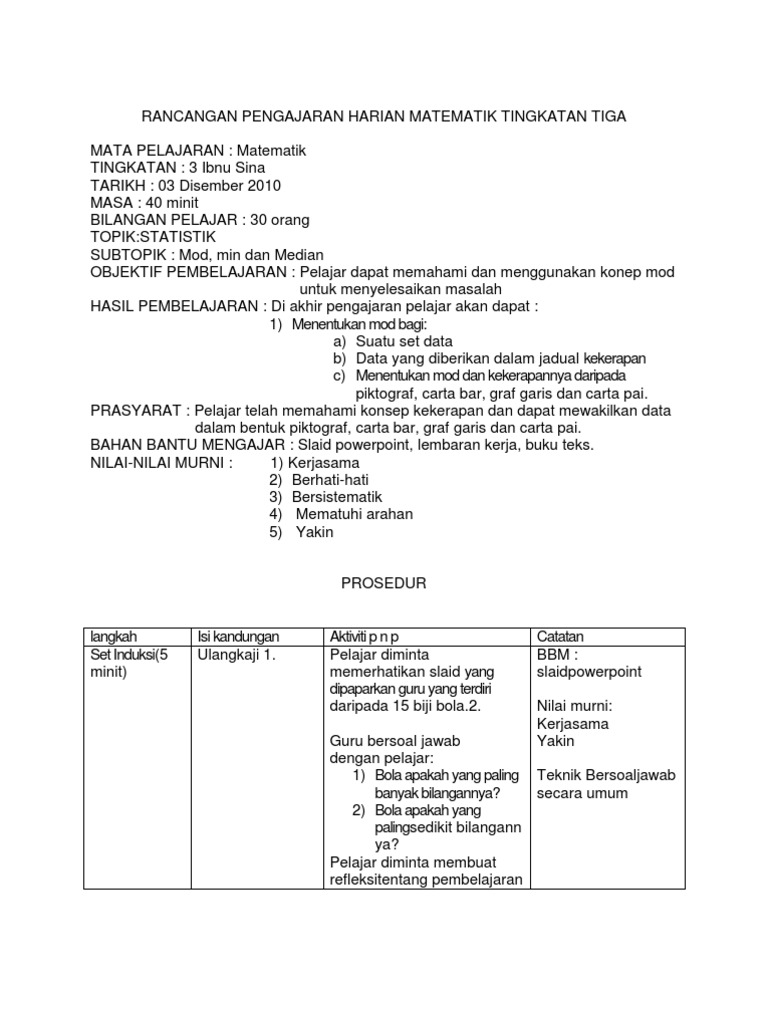 Rancangan Pengajaran Harian Matematik Tingkatan Tiga